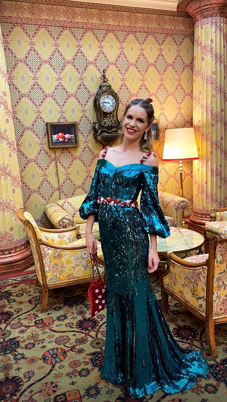Συγκεκριμένα, επέλεξε να φορέσει μία μακριά μπλε τουαλέτα, η οποία είναι ντυμένη εξ’ ολοκλήρου με παγιέτες, με flute μανίκια και off shoulder κόψιμο. Ελείνο συγκρατούνταν από δύο λεπτές τιράντες με μικρά κόκκινα και ροζ άνθη, όπως και η ζώνη. Το στυλ της ολοκληρώθηκε, με ένα κόκκινο βελούδινο τσαντάκι – πουγκί. Επίσης, είχε τα μαλλιά της πιασμένα μισά – μισά και στολισμένα, με τα ίδια άνθη που είχαν οι τιράντες και η ζώνη της.