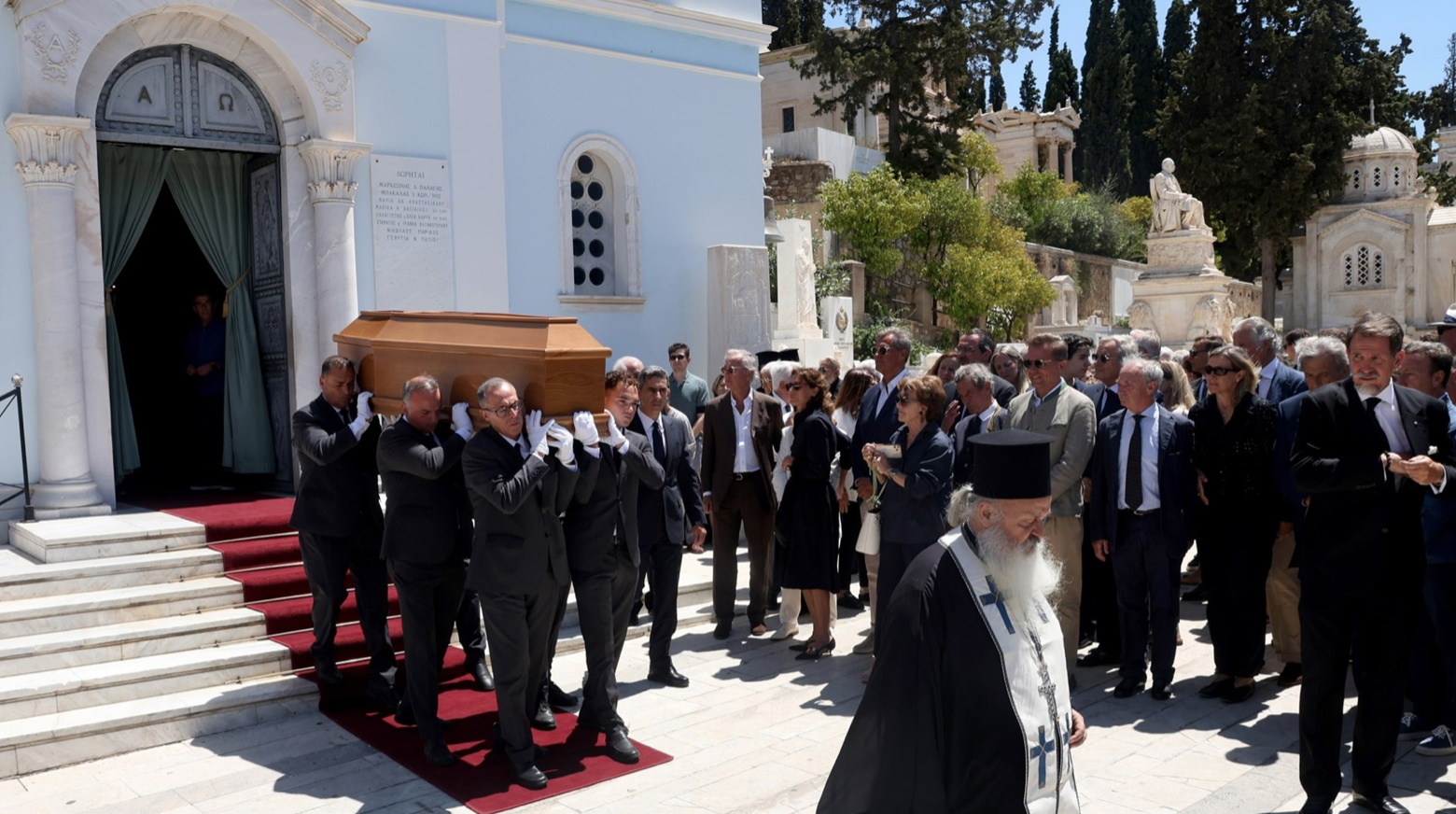 Η βασίλισσα Σοφία διέκοψε τις διακοπές της στη Μαγιόρκα και ταξίδεψε στην Ελλάδα για την κηδεία. Η 86χρονη βασίλισσα φορούσε μια μαύρη πλισέ φούστα με μαύρο πουκάμισο και ιδιαίτερο σακάκι με απλικέ δαντέλα στους ώμους. Συνδύασε το ντύσιμο με μαύρες εσπαντρίγιες και μαύρο καλσόν.