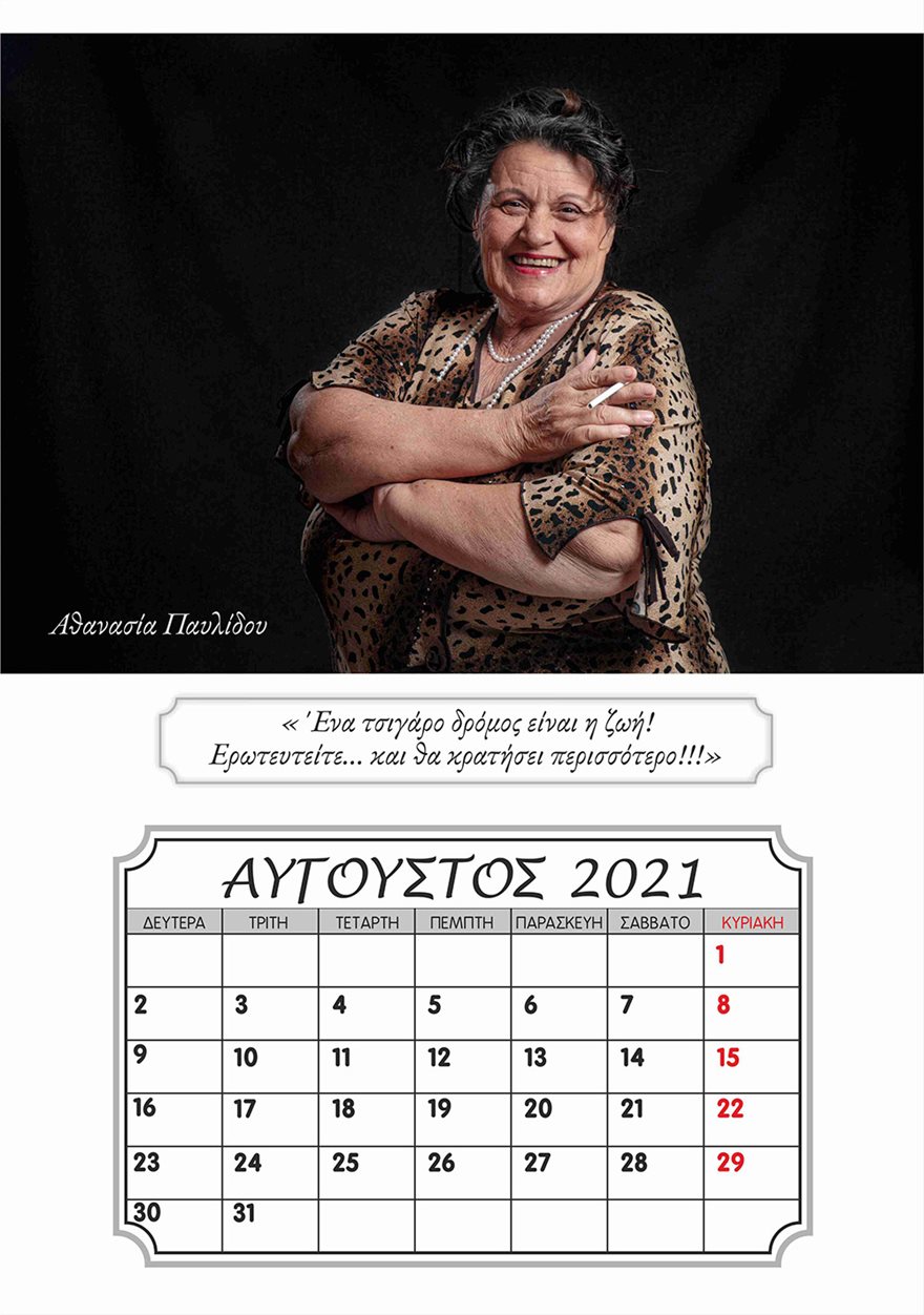 Μαζί με τους συνενοίκους της στο γηροκομείο, τον Λευτέρη Γιαγκίδη, που ποζάρει με το χαρακτηριστικό «καβουράκι» του και το κομπολόι στο χέρι στο εξώφυλλο του ημερολογίου, αλλά και τους Βασιλική Τσοκαλίδου, Κουιμέτ Μουσταφά Ογλού, Αθανασία και Θεόδωρο Παυλίδη, Χαράλαμπο Καραβασίλογλου, Αγαθή Ανδρεάδου, Γεωργία Χατζηαποστόλου και Ευαγγελία Καρακεσίσογλου, η Καλλιόπη Νάκου πόζαρε στον φακό της καλλιτεχνικής ομάδας φωτογραφίας του «ΕΡΓΑΣΤΗΡΙΟΥ ΦΩΤΟΓΡΑΦΙΑΣ», έτους 2019-2020, του Ιδρύματος Θρακικής Τέχνης και Παράδοσης (Ι.Θ.Π.Τ) Ξάνθης. Η καλλιτεχνική αυτή ομάδα μαζί με το γηροκομείο «Ο Μέγας Βασίλειος» και την εθελόντρια Σοφία Σαλβανά ένωσαν δυνάμεις και φαντασία και μεταμόρφωσαν τους ηλικιωμένους σε «πρωταγωνιστές σε πρώτο πλάνο».