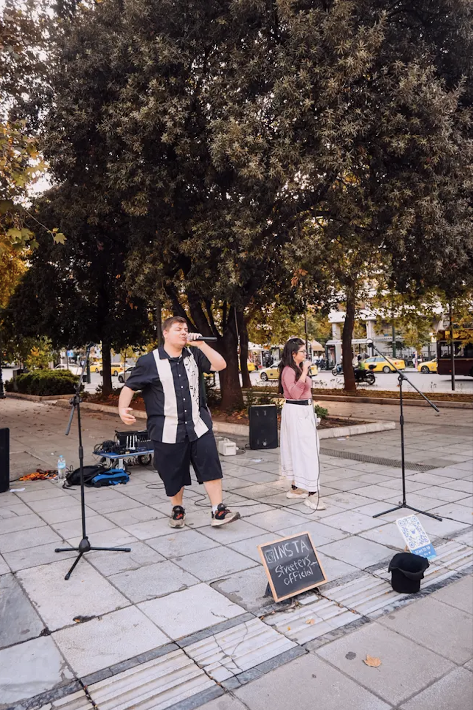 Από τη στιγμή που ξεκινά το show, γίνεται φανερή η άνεση που έχει με το κοινό. Συνομιλεί με τους περαστικούς, τους πειράζει και ανταποκρίνεται με χιούμορ στα σχόλιά τους, δημιουργώντας μια ζεστή και διαδραστική ατμόσφαιρα.