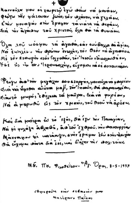 «Μανούλα μου σε χαιρετώ εγώ πάω να μονάσω, Φεύγω την μάταιαν ζωήν, τον πλάνον, να γελάσω, Στην μοναξιάν στην έρημον τα νιάτα να περάσω, Δια την αγάπην του Χριστού, όλα θα τα θυσιάσω. Όλα του κόσμου τα αγαθά, σαν σκύβαλλα θα αφήσω, Να εκτελέσω την πρώτη εντολήν, τον Θεόν να αγαπήσω Με τον σταυρόν στον Γολγοθάν, τον Ιησούν ν’ακολουθήσω, Και εις την άνω Ιερουσαλήμ, εύχομαι να σε συναντήσω. Φεύγω απ’ την μεγάλην σου στοργήν, μαννούλα να μπορέσω Δια να ήμεθα αιώνια μαζί, τον Ιησούν, θα παρακαλέσω, Διαυτό μικρός εθέλησα τα μαύρα, δια να φορέσω, Να αφιερωθώ εις τον Χριστόν, του Θεού να αρέσω. Και δια μητέρα εις το εξής, θα έχω την Παναγίαν, Να με φυλάξη αβλαβή, απ’ του εχθρού την πανουργίαν Μάννα μου με κατάνυξιν, στην έρημον εδώ στην ησυχίαν Θα εύχομαι πάντα δια εσέ, και διόλην την πολιτείαν».