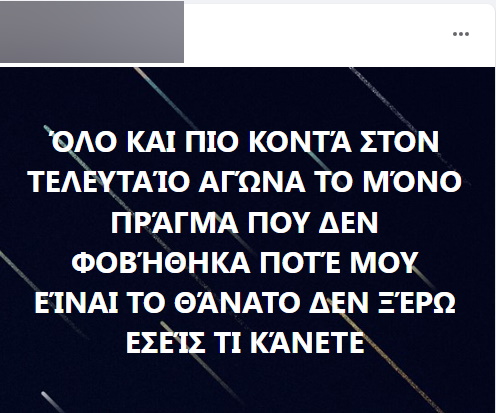 «Όλο και πιο κοντά στον τελευταίο αγώνα το μόνο που δεν φοβήθηκα ποτέ μου είναι ο θάνατος δεν ξέρω εσείς τι κάνετε», έγραψε στην τελευταία του ανάρτηση.