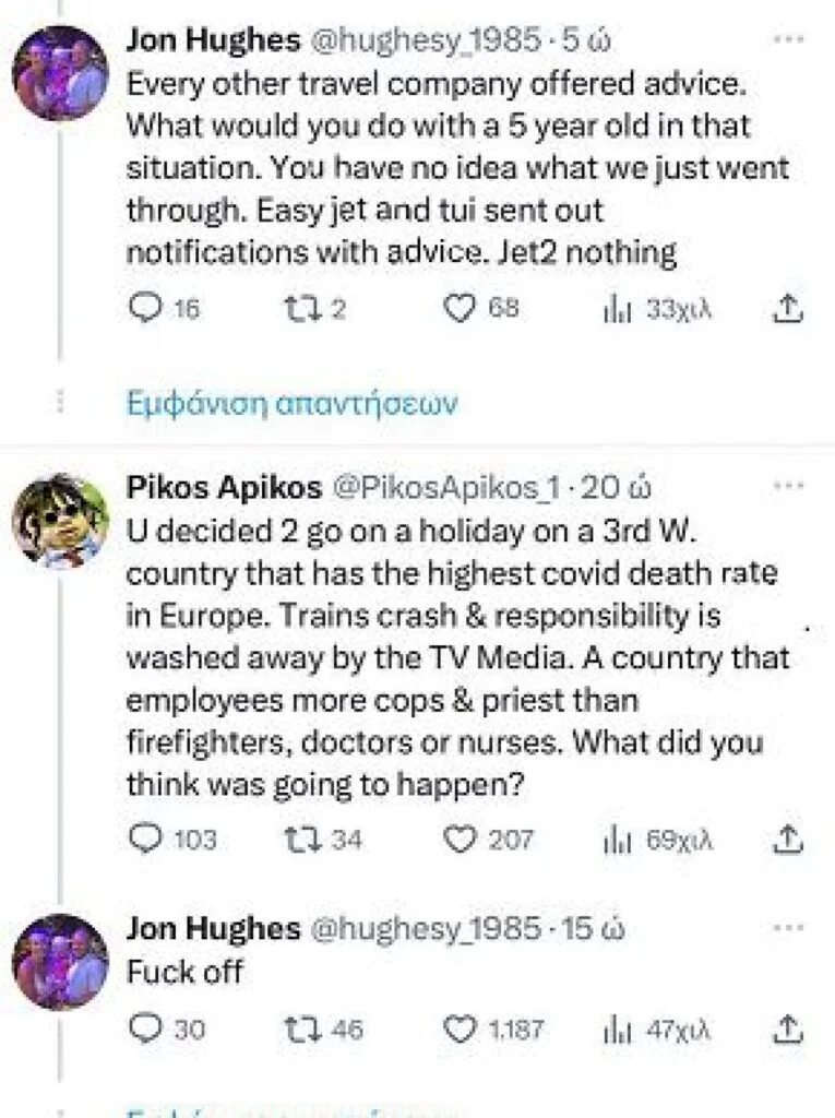 Στο παραπάνω βίντεο ο χρήστης του Twitter με το ψευδώνυμο “Pikos Apikos” σχολίασε: «Αποφάσισες να πας διακοπές σε μια τριτοκοσμική χώρα που έχει το υψηλότερο ποσοστό θνησιμότητας από Covid στην Ευρώπη. Τρένα τρακάρουν και η ευθύνη ξεπλένεται από τα τηλεοπτικά μέσα. Είναι μια χώρα που απασχολεί περισσότερους αστυνομικούς και ιερείς παρά πυροσβέστες, γιατρούς ή νοσοκόμους. Τι νόμιζες ότι θα γινόταν;».