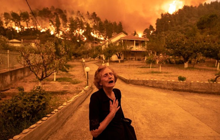 Από αυτές τις φωτογραφίες, δύο αφορούν την Ελλάδα. Η πρώτη απεικονίζει την κυρία Παναγιώτα κατά την διάρκεια των φονικών πυρκαγιών στην Εύβοια το 2021. Στο βλέμμα της φαίνεται η απόγνωση και ο πόνος που ακολούθησε την καταστροφή.