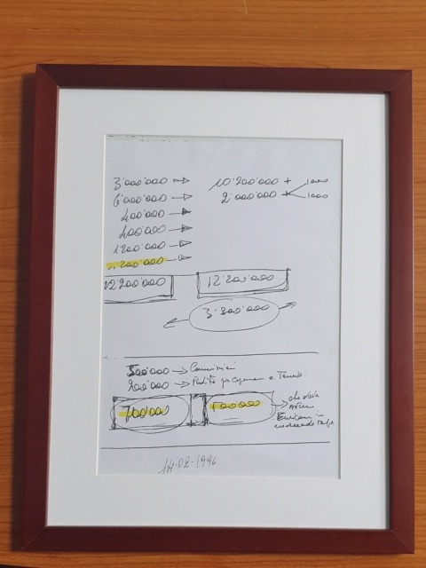 Ειδικότερα, η χαρτοπετσέτα «διηγείται» την απαρχή μιας δυνατής ελληνοϊταλικής επιχειρηματικής συνεργασίας, που τα βασικά της στοιχεία συμφωνήθηκαν πάνω στο τραπέζι γνωστής ψαροταβέρνας της Θεσσαλονίκης.
