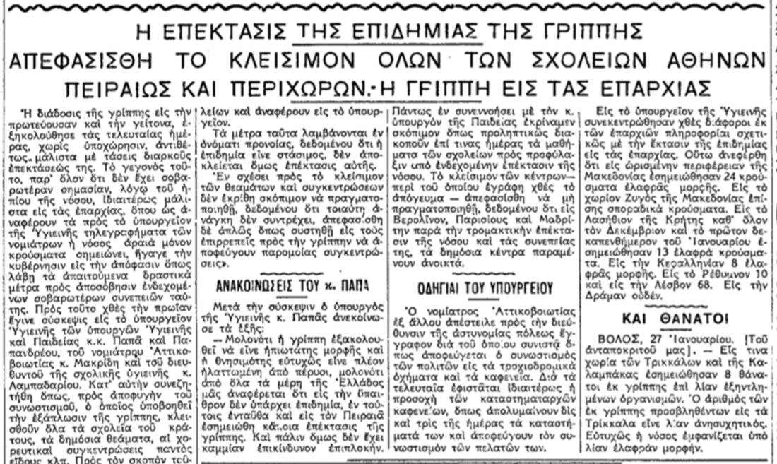 Κορονοϊός μπορεί να μην υπήρχε, ωστόσο και η κοινή γρίπη έκανε μια χαρά τη «δουλειά» της, με τα κρούσματα να πολλαπλασιάζονται μέρα με την ημέρα κάτι που είχε ως αποτέλεσμα η κυβέρνηση να πάρει δραστικά μέτρα, κλείνοντας όλα τα σχολεία Αθηνών, Πειραιώς και περιχώρων, θέατρα και κινηματογράφους, παροτρύνοντας το κοινό να αποφεύγει το συνωστισμό και θέτοντας τις υγειονομικές υπηρεσίες σε συνεχή επαγρύπνηση. Περίπου δηλαδή ό,τι συμβαίνει και σήμερα.
