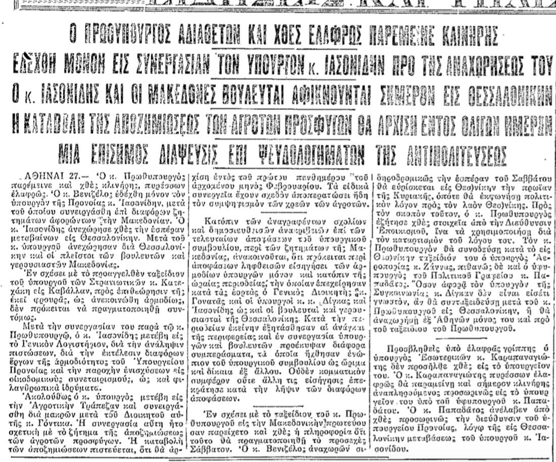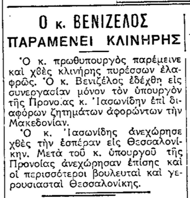 Οπότε, όταν άρπαξε τη γρίπη αρχές του 1931 μαζί με χιλιάδες άλλους Έλληνες, φρόντισε να παραμείνει στην οικία του και να συνεννοείται με τους συνεργάτες του από απόσταση. «Ο κ. Πρωθυπουργός παρέμεινε και χθες κλινήρης πυρέσσων ελαφρώς. Ο κ. Βενιζέλος εδέχθη εις συνεργασίαν μόνο τον υπουργόν της Πρόνοιας κ. Ιασωνίδην επί διαφόρων ζητημάτων αφορώντων την Μακεδονίαν. Ο κ. Ιασωνίδης ανεχώρησε χθες την εσπέραν εις Θεσσαλονίκην», διαβάζουμε στην εφημερίδα «Ελεύθερον Βήμα» της 27ης Ιανουαρίου 1931.