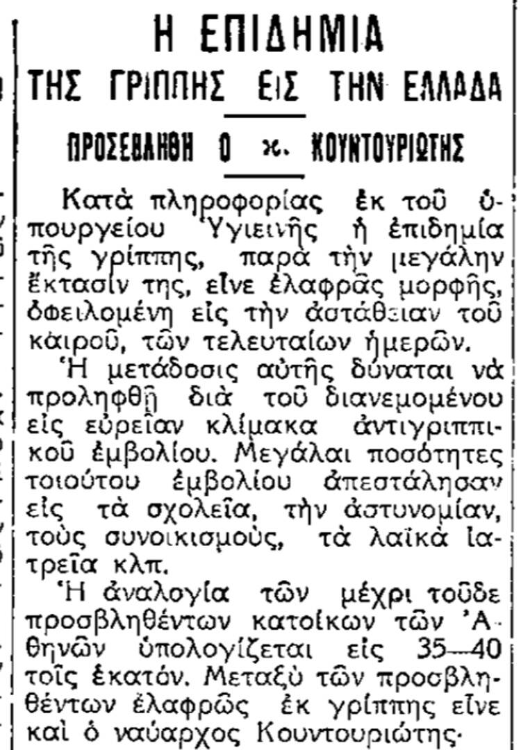 Ο πρώην αντιβασιλέας, πρόεδρος της Ελληνικής Δημοκρατίας και κυβερνήτης του καταδρομικού «Γ. Αβέρωφ», Παύλος Κουντουριώτης, ήταν κατά των φαρμάκων. Πίστευε ότι η μητέρα φύση θα γιατρέψει την ίωση μόνη της, οπότε απλώς παρέμενε σπίτι και περίμενε να περάσουν οι μέρες, ώστε να κάνει τον κύκλο της η ασθένεια και να μπορέσει να επανέλθει στις υποχρεώσεις του.