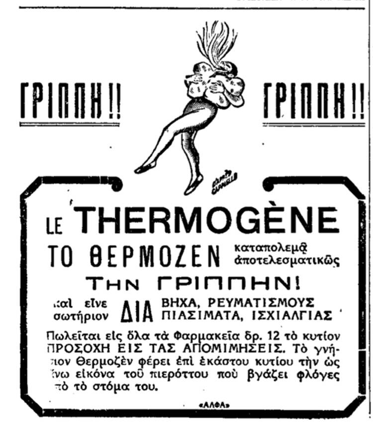 Το πιο απολαυστικό κείμενο, πάντως, για την κατάσταση που επικρατούσε εκείνες τις ημέρες με την ίωση, ήταν αυτό που δημοσιεύτηκε στην εφημερίδα «Ελεύθερον Βήμα» της 24ης Ιανουαρίου 1931, υπογεγραμμένο από έναν «Φορτούνιο», υπό τον τίτλο «Γριππίτσα». Διαβάζουμε (με την ορθογραφία της εποχής): «Δεν έχετε; Ούτε καν ελαφριά; Ούτε όση για να φέρνετε μόλις το μαντηλάκι στη μυτίτσα, κάθε δέκα λεπτά έστω, κλείνοντας τα μάτια με ύφος κουρασμένο; Ε, μα τότε, κυρία, δεσποινίς, δεν είσθε διόλου της μόδας! Μια κυρία καθώς πρέπει αυτή τη στιγμή πρέπει να είνε τουλάχιστον συναχωμένη. Υπάρχουν αρρώστειες της μόδας, όπως και καπέλλα, φούστες και τσαντάκια, που μια κυρία, σεβόμενη τον εαυτό της, πρέπει να της περάση, όταν έρχεται η «σαιζόν». Απ’ αυτές είναι η γρίππη. Η τύχη της είνε από της πιο περίεργες. Άλλοτε τη λέγανε “ιμφουέντζα”».