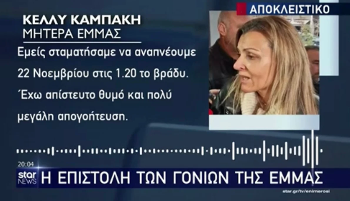 Η μητέρα της Έμμας δήλωσε στην τηλεόραση του Star: «Εμείς σταματήσαμε να αναπνέουμε 22 Νοεμβρίου στις 1:20 το βράδυ. Έχω απίστευτο θυμό και πολύ μεγάλη απογοήτευση».