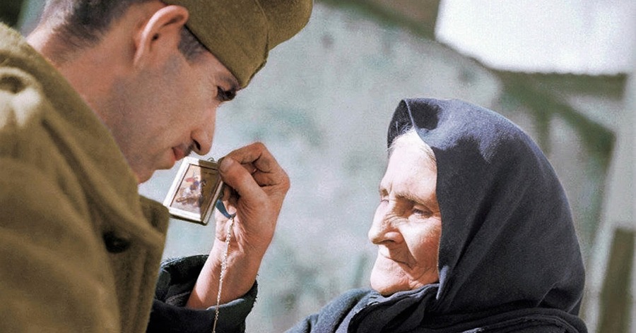 Η μαυροφορεμένη Ελληνίδα μάνα, με τη μαντίλα στο κεφάλι της, σφίγγει το γιο της. Σφίγγει το γιο της και του δίνει την ευλογία του Αγίου Γεωργίου. Πρόκειται για μια συγκλονιστική και συγκινητική στιγμή, την οποία ευτυχώς απαθανάτισε ο φωτογραγικός φακός.