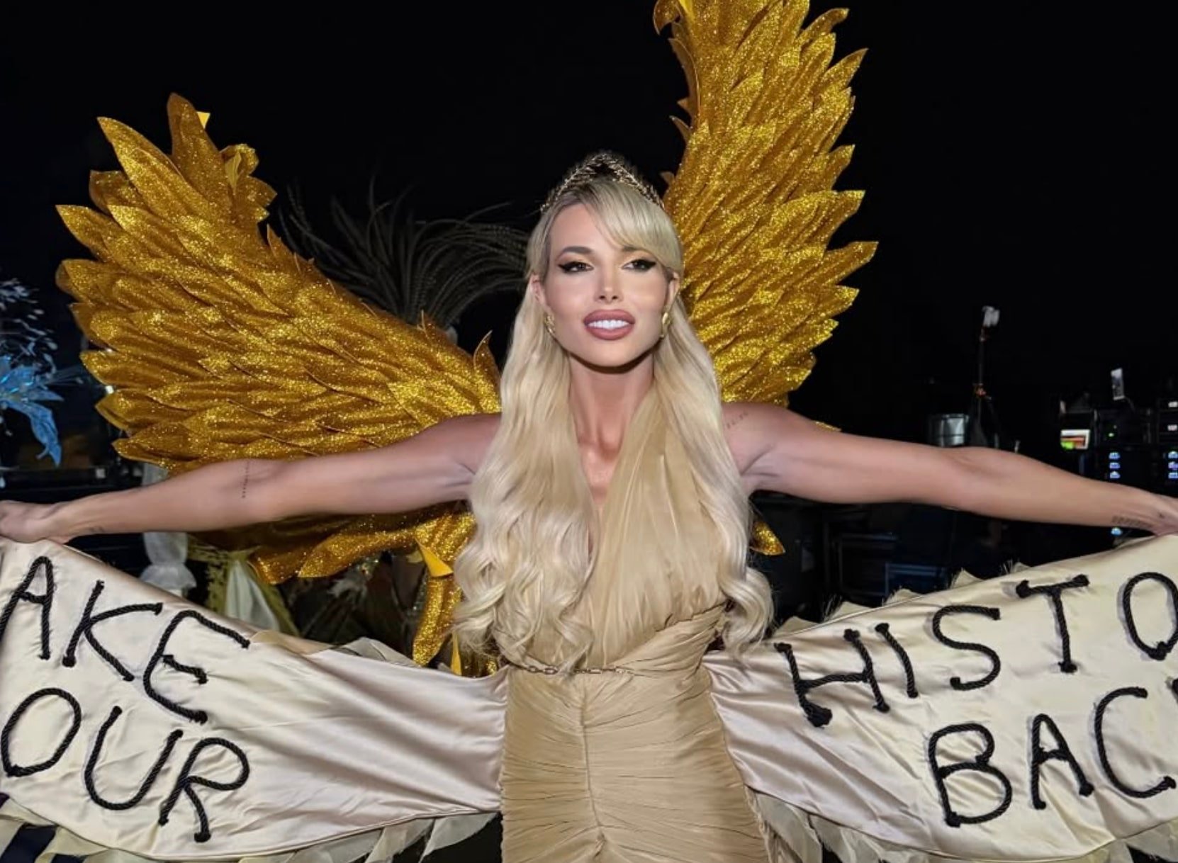 Με χρυσά φτερά και φόρεμα εμπνευσμένο από το εμβληματικό άγαλμα, η εμφάνισή της συνδύασε μέλος ελληνικής αισθητικής με σύγχρονη σκηνική παρουσία. Ιδιαίτερο ενδιαφέρον προκάλεσε η φράση «Take our history back» στο εσωτερικό των φτερών, ένα ξεκάθαρο μήνυμα για τις ελληνικές αρχαιότητες που παραμένουν εκτός Ελλάδας, προσδίδοντας στην εμφάνισή της χαρακτήρα πολιτισμικής διεκδίκησης.
