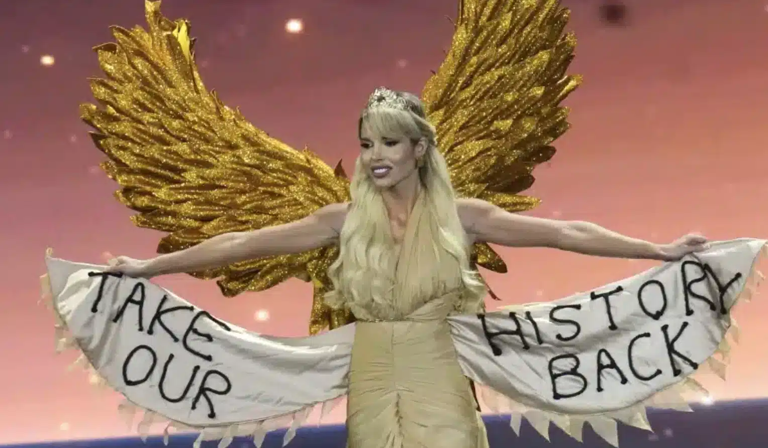 Με χρυσά φτερά και φόρεμα εμπνευσμένο από το εμβληματικό άγαλμα, η εμφάνισή της συνδύασε μέλος ελληνικής αισθητικής με σύγχρονη σκηνική παρουσία. Ιδιαίτερο ενδιαφέρον προκάλεσε η φράση «Take our history back» στο εσωτερικό των φτερών, ένα ξεκάθαρο μήνυμα για τις ελληνικές αρχαιότητες που παραμένουν εκτός Ελλάδας, προσδίδοντας στην εμφάνισή της χαρακτήρα πολιτισμικής διεκδίκησης.