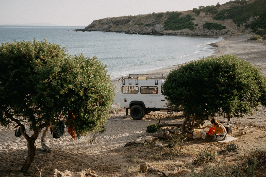 Μέχρι που κάποια στιγμή γνώρισα έναν μηχανικό αυτοκινήτων που μου υποσχέθηκε ότι θα μετέτρεπε ένα παλιό Land Rover Defender 110 του 1990, το οποίο είχα αγοράσει, σε “campervan”. Έτσι κι έγινε» εξηγεί ο Χρήστος.