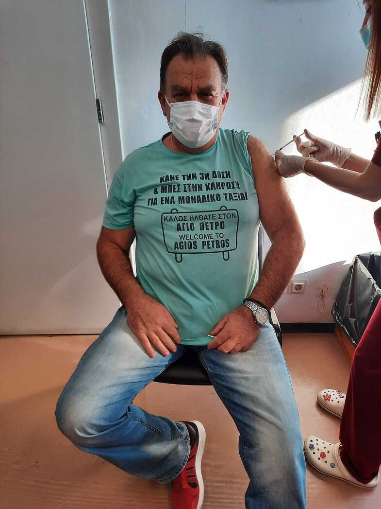 Συγκεκριμένα, ο Σπύρος Βέρροιος από την Πάτρα προσήλθε στο εμβολιαστικό κέντρο για να κάνει την τρίτη δόση του εμβολίου, φορώντας ένα μπλουζάκι το οποίο έγραφε:
