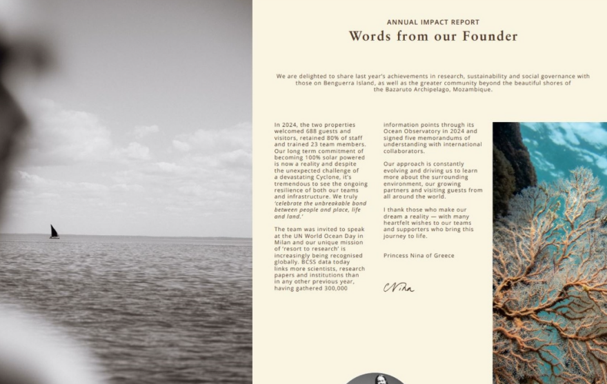 Ο τρόπος με τον οποίο υπέγραψε η Νίνα Φλορ την ετήσια έκθεση του πολυτελούς εξωτικού θέρετρου που διατηρεί στη Μοζαμβίκη προκάλεσε αίσθηση, καθώς η σύζυγος του Φίλιππου Ντε Γκρες, επέλεξε να χρησιμοποιήσει την υπογραφή «Πριγκίπισσα της Ελλάδας».