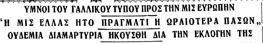 Αλίκη Διπλαράκου: «Η χθεσινή νίκη της ωραίας Ελληνίδας αποτελεί δια την Ελλάδα, την ωραιοτέραν διαφήμισιν και πανηγυρικήν αναγνώρισιν της ελληνικής ευγενίας και συγχρόνως την λαπροτέραν εισαγωγήν εις τας προσεχείς εορτάς της Εθνικής εκατονταερτηρίδος». Αυτά, ανέφερε στις 7 Φεβρουαρίου του 1930, η καθημερινή, για την ομορφότερη γυναίκα της Ευρώπης, η οποία ήταν και Ελληνίδα.