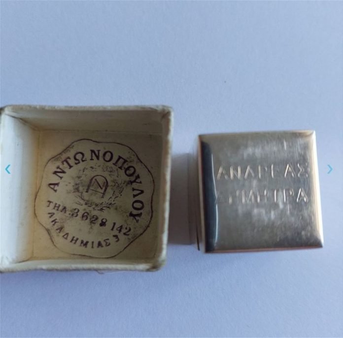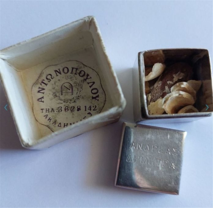 Μέσα στο κουτί υπάρχει η σφραγίδα του διάσημου οίκου στο Κολωνάκι και σύμφωνα με την αγγελία στο διαδίκτυο, κάτοχος της συλλεκτικής μπομπονιέρας είναι ένας συλλέκτης από το Ηράκλειο της Κρήτης, ο οποίος όλα αυτά τα χρόνια την είχε στην συλλογή του.