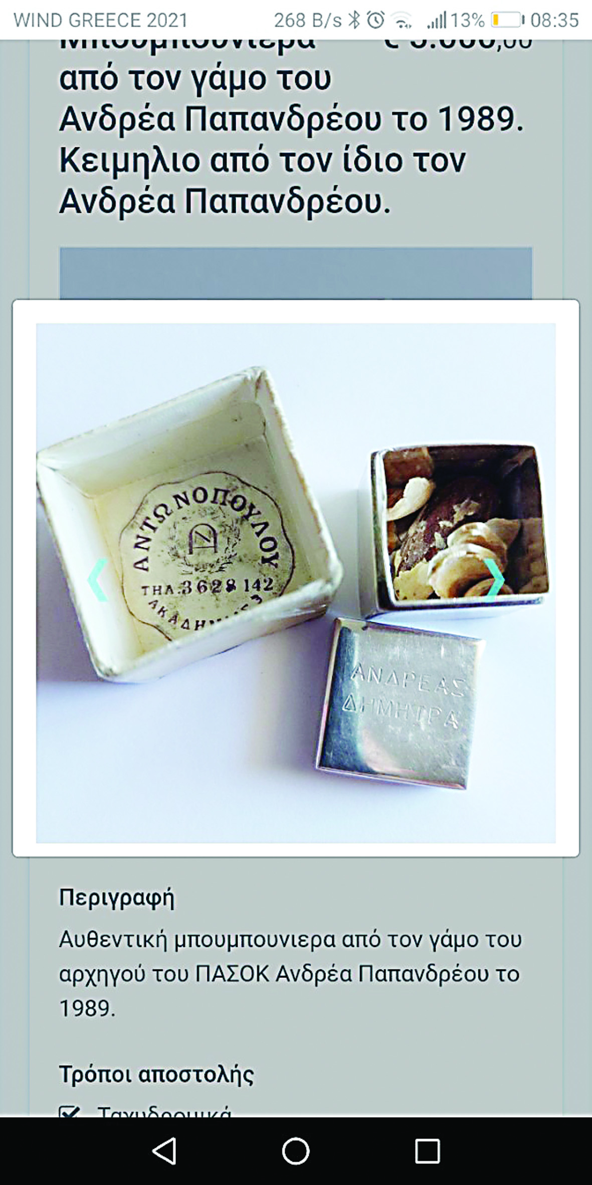 Η μπομπονιέρα του γάμου του Ανδρέα Παπανδρέου και της Δήμητρας Λιάνη, πωλείται στο διαδίκτυο για 5.000 ευρώ.