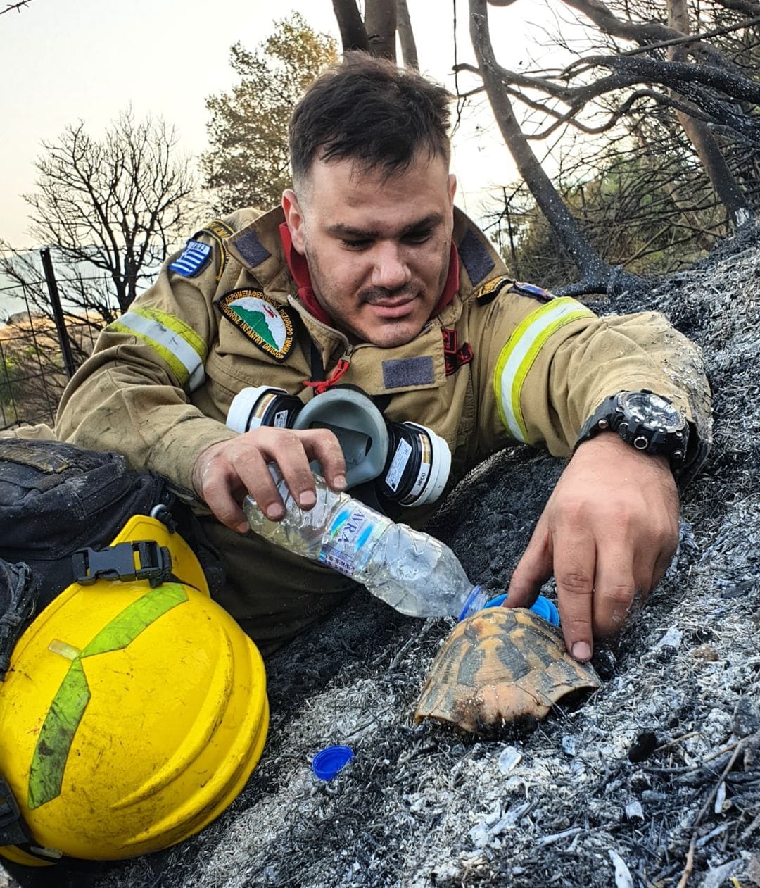 Πυροσβέστης δίνει νερό σε χελώνα – Λεπτομέρειες για το περιστατικό