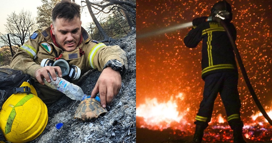 Πυροσβέστης δίνει νερό σε χελώνα: Πρόκειται ίσως για τη φωτογραφία της ημέρας, με τον πυροσβέστη να βοηθά την άτυχη χελώνα στην πυρκαγιά της Αχαΐας.