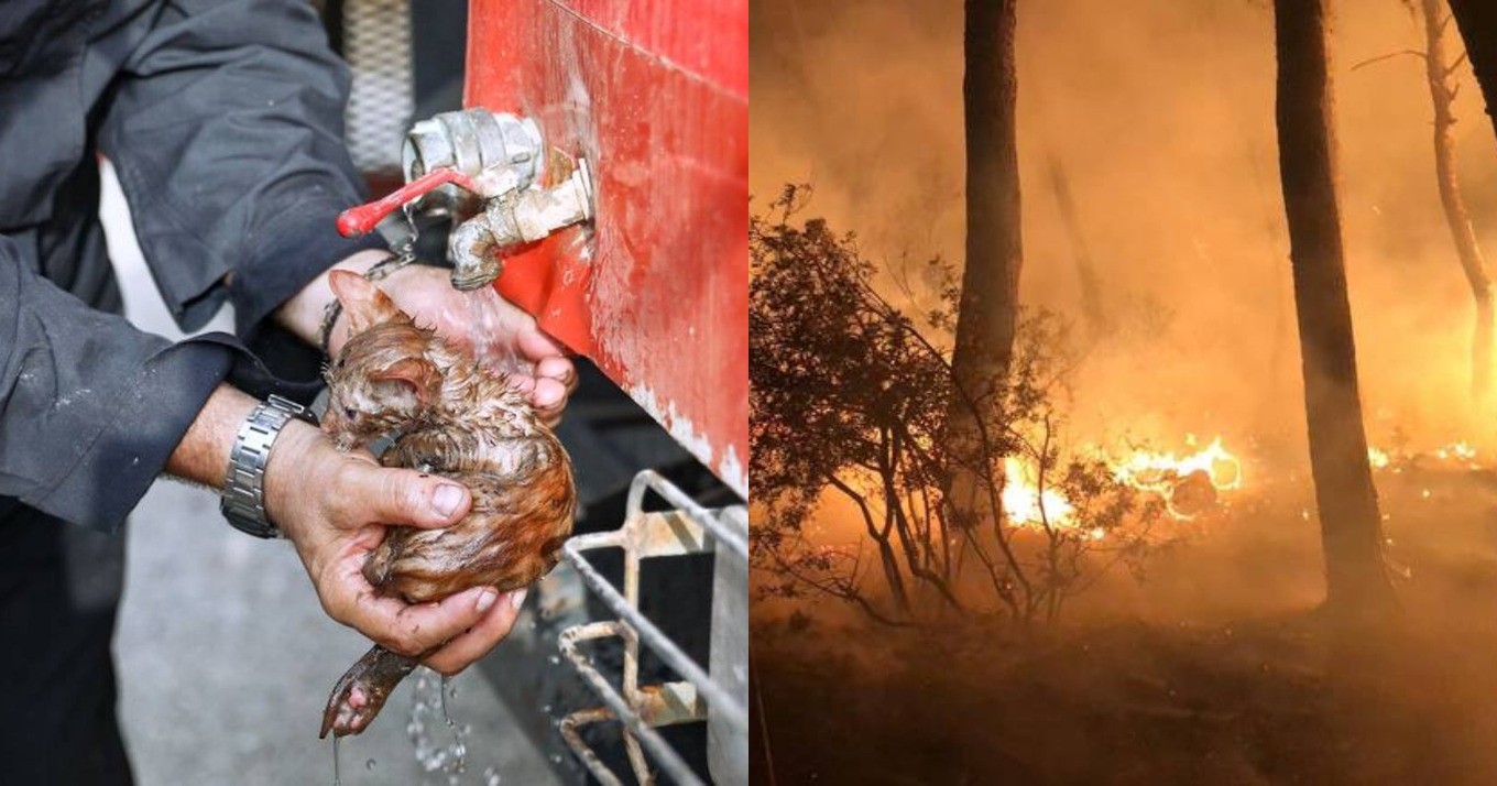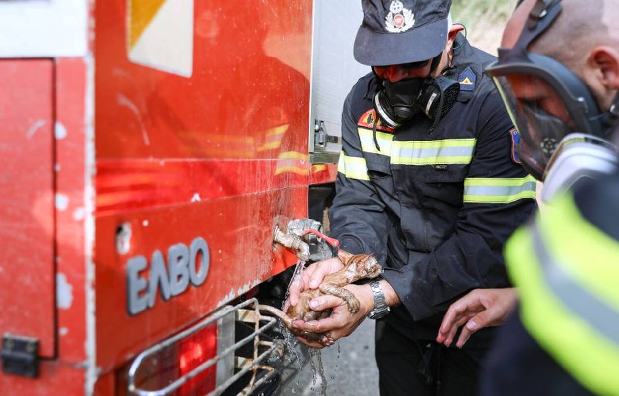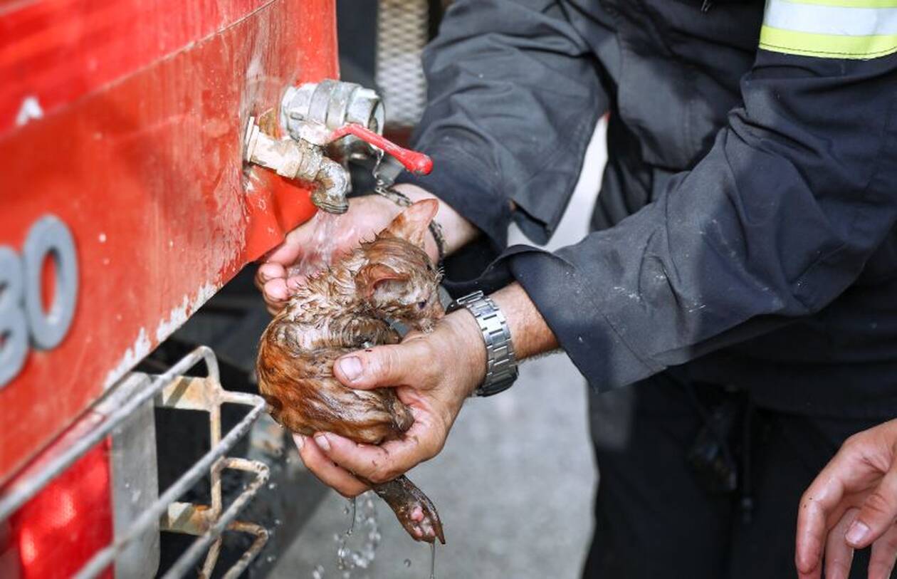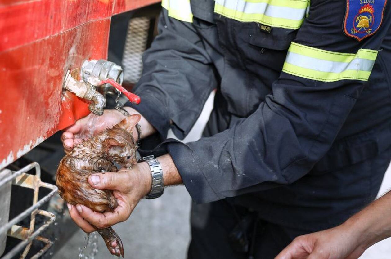 Η συγκινητική στιγμή που πυροσβέστης φροντίζει ένα μικρό γατάκι που σώθηκε από τις φωτιές στη Γορτυνία