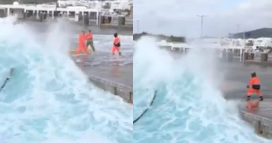 Ωστόσο, η κάμερα έχει καταγράψει καρέ-καρέ τους δυο καβοδέτες να επιχειρούν να αποδεσμεύσουν το καραβόσκοινο, όταν ένα τεράστιο κύμα σκάει πάνω τους. Μάλιστα, ο ένας πέφτει κάτω, ευτυχώς το κύμα τον «έσπρωξε» προς το λιμάνι και όχι προς τη θάλασσα.