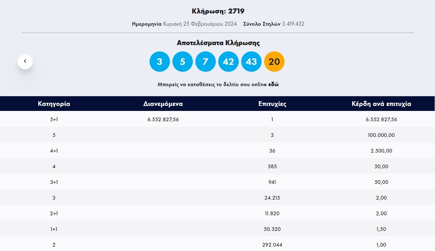 Οι αριθμοί που κληρώθηκαν είναι 3, 5, 7, 42, 43 και τζόκερ το 20.