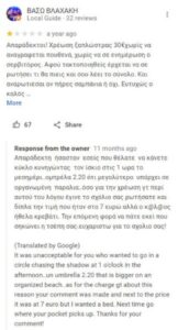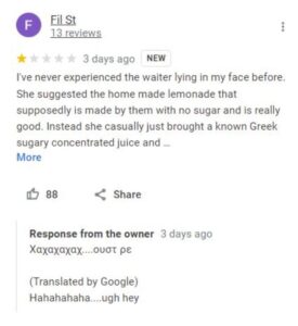 Τι σημαίνει αυτό; Συνήθως όταν κάποιος πελάτης αφήνει αρνητικά σχόλια σε κάποια επιχείρηση, οι ιδιοκτήτες της είτε το αγνοούν είτε προσπαθούν ευγενικά -αφού ζητήσουν συγγνώμη- να απαντήσουν στα παράπονα των δυσαρεστημένων πελατών.
