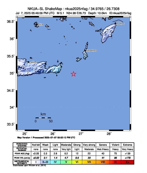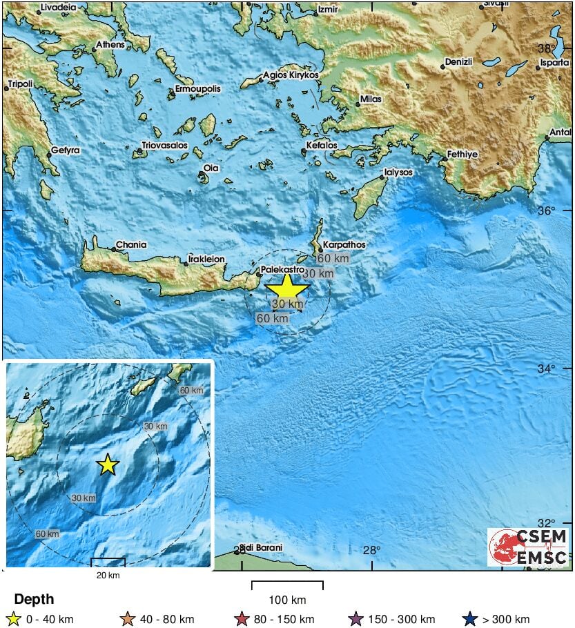 Σύμφωνα με την πρώτη εκτίμηση του Γεωδυναμικού Ινστιτούτου ο σεισμός είχε μέγεθος 5,1 Ρίχτερ και επίκεντρο τη θαλάσσια περιοχή 44χλμ ανατλικά της Ζάκρου στο Λασίθι.