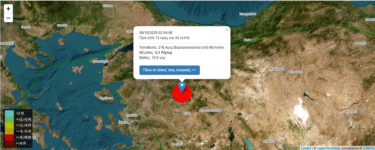 Σύμφωνα με πρώτες πληροφορίες, από σεισμός 5,1 Ρίχτερ 216,4χλμ Βορειοανατολικά από Μυτιλήνη στις 09/10/2025 02:54:06