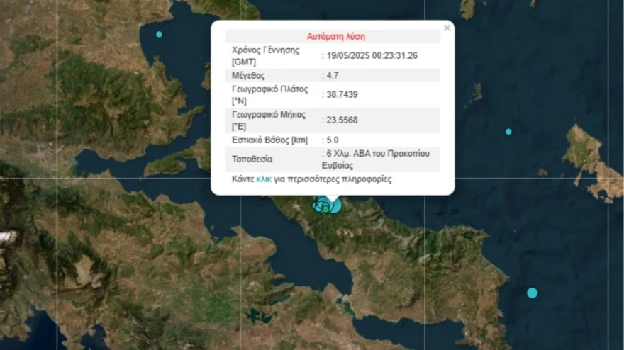 Το επίκεντρο εντοπίστηκε 8 χλμ ανατολικά του Προκοπίου Ευβοίας και το εστιακό βάθος ήταν στα 5 χλμ, σύμφωνα με την Αυτόματη Λύση του Γεωδυναμικού Ινστιτούτου