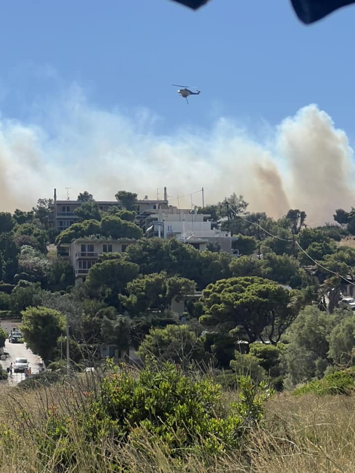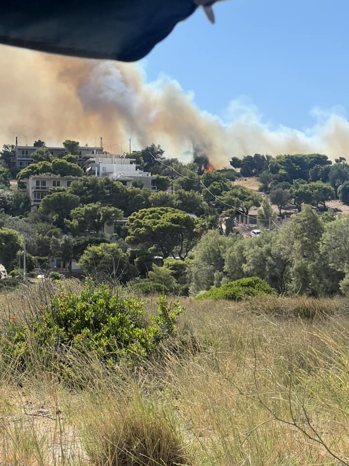 Η φωτιά οριοθετήθηκε, αλλά υπάρχουν διάσπαρτες μικρές εστίες και τα εναέρια μέσα κάνουν αγώνα δρόμου για να τις σβήσουν, πριν απειλήσουν τα σπίτια του οικισμού.