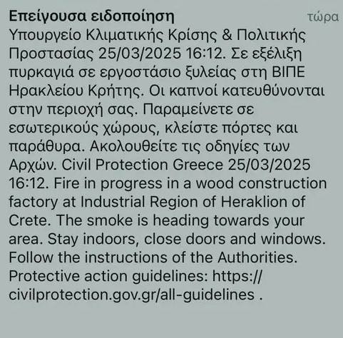 Λόγω του πυκνού καπνού που έχει καλύψει την περιοχή, ενεργοποιήθηκε η υπηρεσία 112, με μήνυμα που προειδοποιεί τους κατοίκους να παραμείνουν σε εσωτερικούς χώρους για την ασφάλειά τους. Οι αρχές συνεχίζουν να παρακολουθούν την κατάσταση, ενώ οι πυροσβεστικές δυνάμεις παραμένουν σε επιφυλακή.