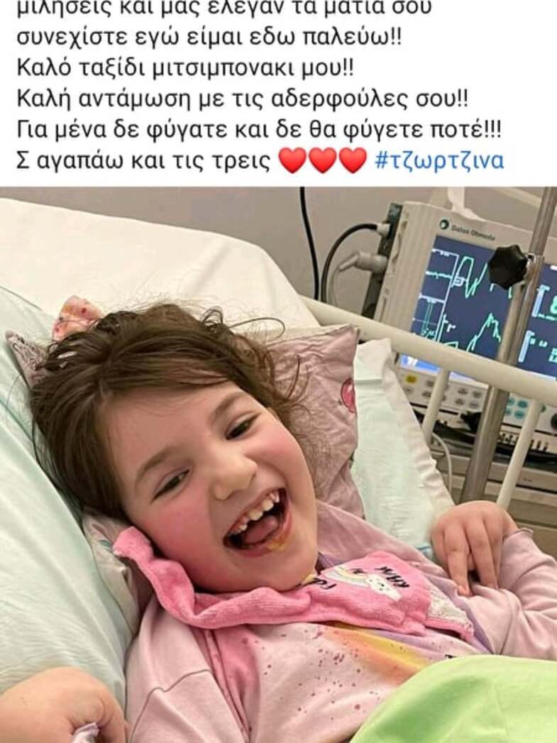 Ραγίζει καρδιές η ανάρτηση της Ρούλας Πισπιρίγκου, μητέρας της 9χρονης Τζωρτζίνας, η οποία σε διάστημα τριών ετών έχασε και τα τρία της κορίτσια στην Πάτρα.