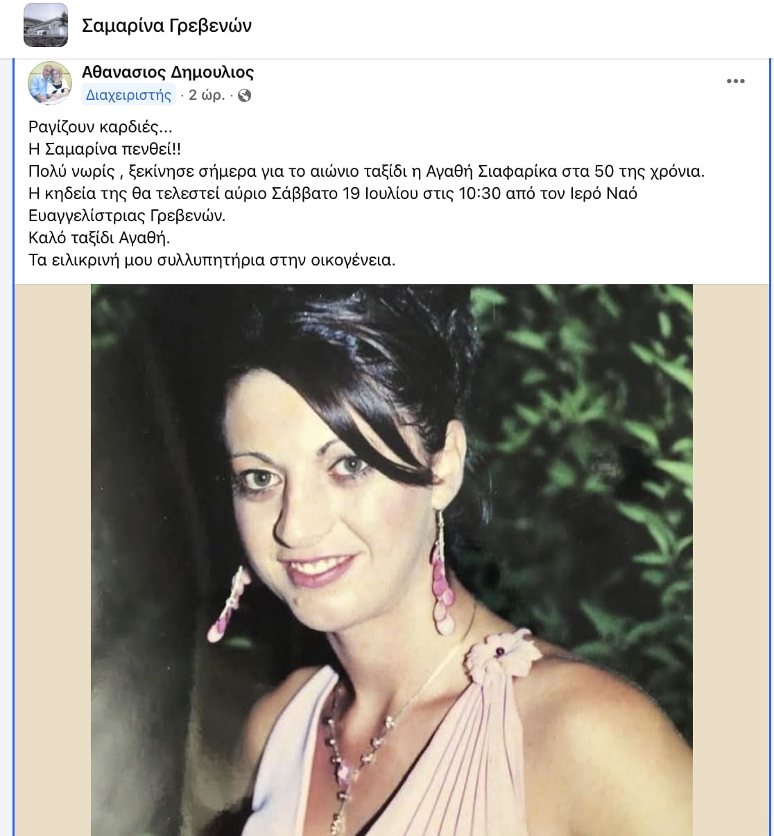 Με απέραντη θλίψη και βαρύ πένθος αποχαιρετά σήμερα η τοπική κοινωνία της Σαμαρίνας την Αγαθή Σιαφαρίκα, η οποία έφυγε πρόωρα από τη ζωή, σε ηλικία μόλις 50 ετών. Η είδηση του θανάτου της σκόρπισε σοκ και συγκίνηση, όχι μόνο στους συγγενείς και φίλους της, αλλά και σε όλη την ευρύτερη περιοχή των Γρεβενών, όπου ήταν ιδιαίτερα αγαπητή.