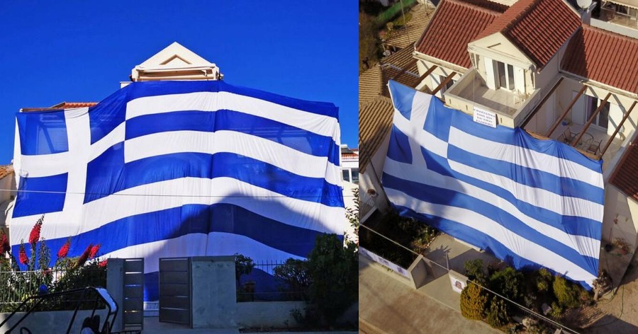 Η εν λόγω σημαία έχει ούτε λίγο ούτε πολύ μέγεθος 140 τετραγωνικά μέτρα, ενώ ο ιδιοκτήτης του σπιτιού είχε καλύψει το σπίτι του με την ίδια σημαία και την 25 Μαρτίου.