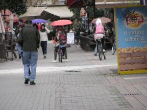 Νόμιζα πως αυτό είναι κάτι που συμβαίνει μόνο στο Άμστερνταμ ή την Κοπεγχάγη. Εκεί, όταν ψιλοβρέχει οι πολίτες ανοίγουν την ομπρέλα τους και ποδηλατούν. Στο ‘να χέρι το τιμόνι στ’ άλλο χέρι την ομπρέλα. Δεν κινδυνεύουν διότι βρίσκονται στον ποδηλατόδρομο. Ε, το ίδιο γίνεται και στην Καρδίτσα: Μόλις ξεκίνησε η ψιχάλα οι κοπέλες της φωτογραφίας άνοιξαν την ομπρελίτσα τους και… έφυγαν με πετάλι.