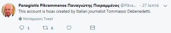 Ένα tweet από έναν λογαριασμό που ισχυριζόταν πως ανήκει στον αντιπρόεδρο της κυβέρνησης Παναγιώτη Πικραμμένο προκάλεσε πανικό στα social media.