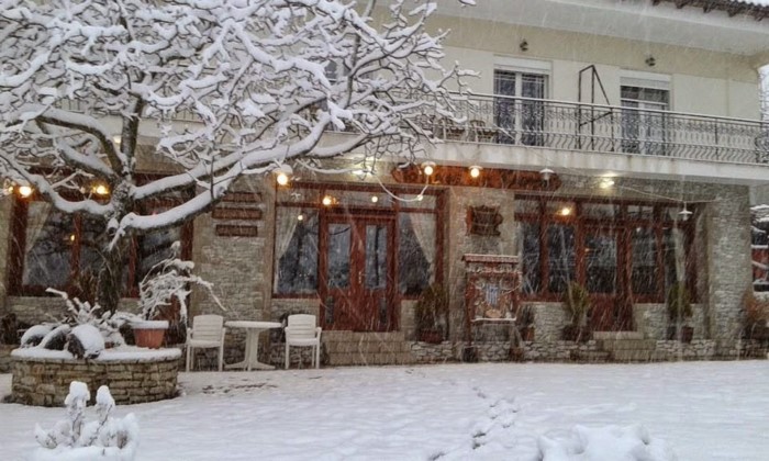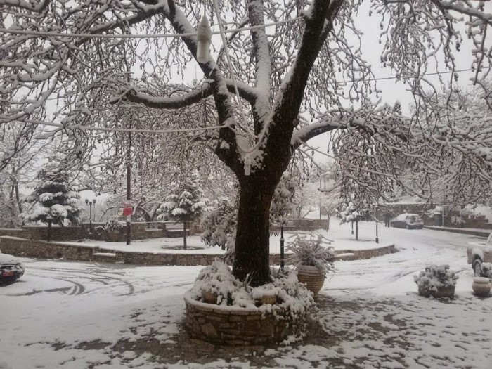Η πέτρινη βρύση στην πλατεία μέρα νύχτα τρέχει κρυστάλλινο της πηγής νερό, ενώ από πάνω, γυμνές οι καρυδιές συνδυάζονται με το φθινοπωρινό, αυτό τον καιρό, τοπίο.