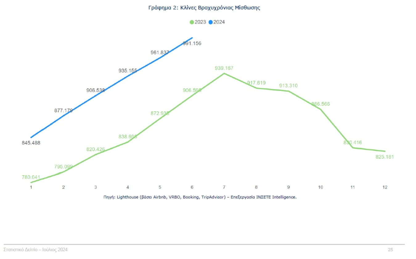 Το ινστιτούτο σημειώνει ότι η αύξηση των καταλυμάτων Airbnb το 2024 αντικατοπτρίζει τη δυναμική ανάπτυξη του κλάδου της βραχυχρόνιας μίσθωσης. Ο αριθμός των καταλυμάτων τον Ιούνιο αυξήθηκε σε 224.860, από 204.578 τον ίδιο μήνα του προηγούμενου έτους. Παρόμοια είναι η εικόνα και στον αριθμό των κλινών, με μια προοδευτική αύξηση από τον Ιανουάριο μέχρι τον Μάιο του 2024 σε σύγκριση με το 2023.