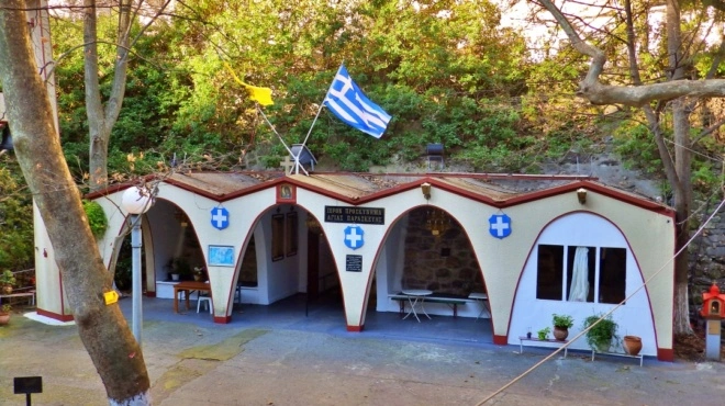Ακριβώς δίπλα από το ναό της Αγίας Παρασκευής βρίσκεται μία μικρή σπηλιά. Εκεί είναι και το αρχικό προσκύνημα, όπου στο τέλος της σπηλιάς από μία οπή στο βράχο αναβλύζει το θαυματουργό αγίασμα της Αγίας Παρασκευής. Η σπηλιά είναι τόσο μικρή που κάθε φορά χωράει μετά βίας μόνο ένας άνθρωπος και αν είναι αρκετά ψηλός πρέπει να μπει σκυμμένος.