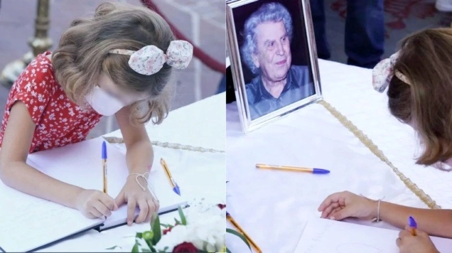 «Σε αγαπάμε φίλε μας», είναι ό,τι έγραψε στο βιβλίο συλλυπητηρίων για τον Μίκη Θεοδωράκη, ενώ σχεδίασε και δύο μεγάλες καρδιές.