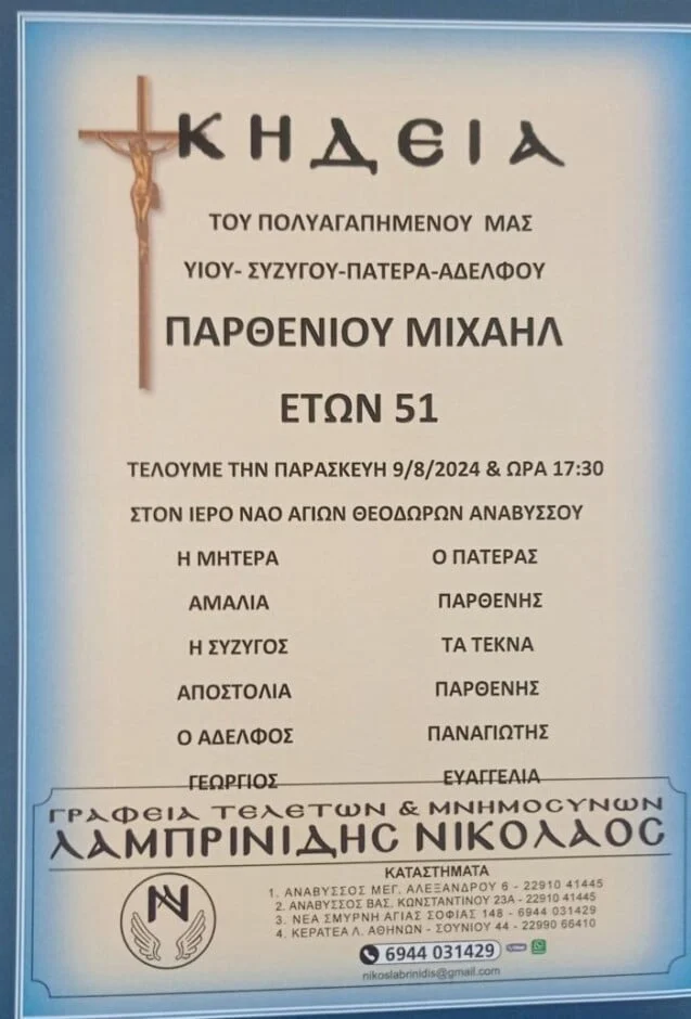 Η κηδεία του έγινε την Παρασκευή 9/8 στον Ι.Ν Αγίων Θεοδώρων Αναβύσσου.