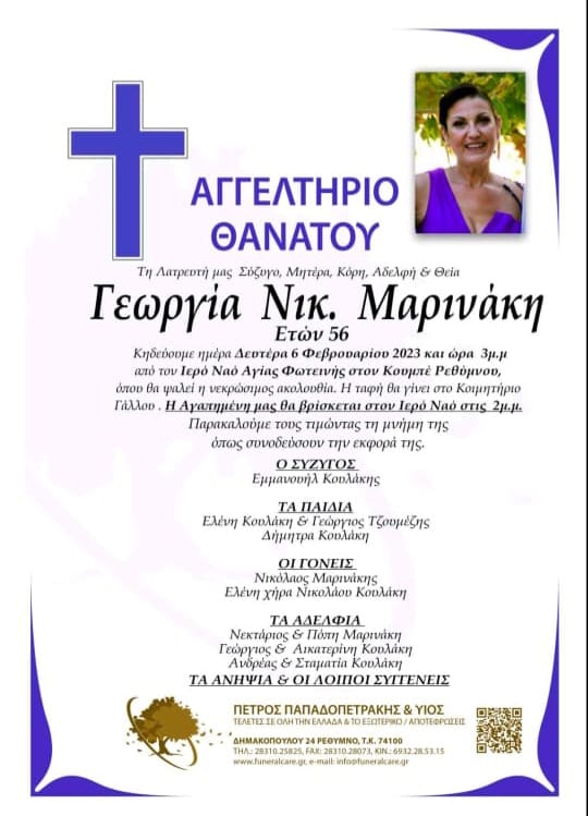 Μεγάλη θλίψη σκόρπισε στην Κρήτη και συγκεκριμένα στην τοπική κοινωνία του Ρεθύμνου η απώλεια της Γωγώς Μαρινάκη -Κουλάκη, που «έφυγε» από τη ζωή.