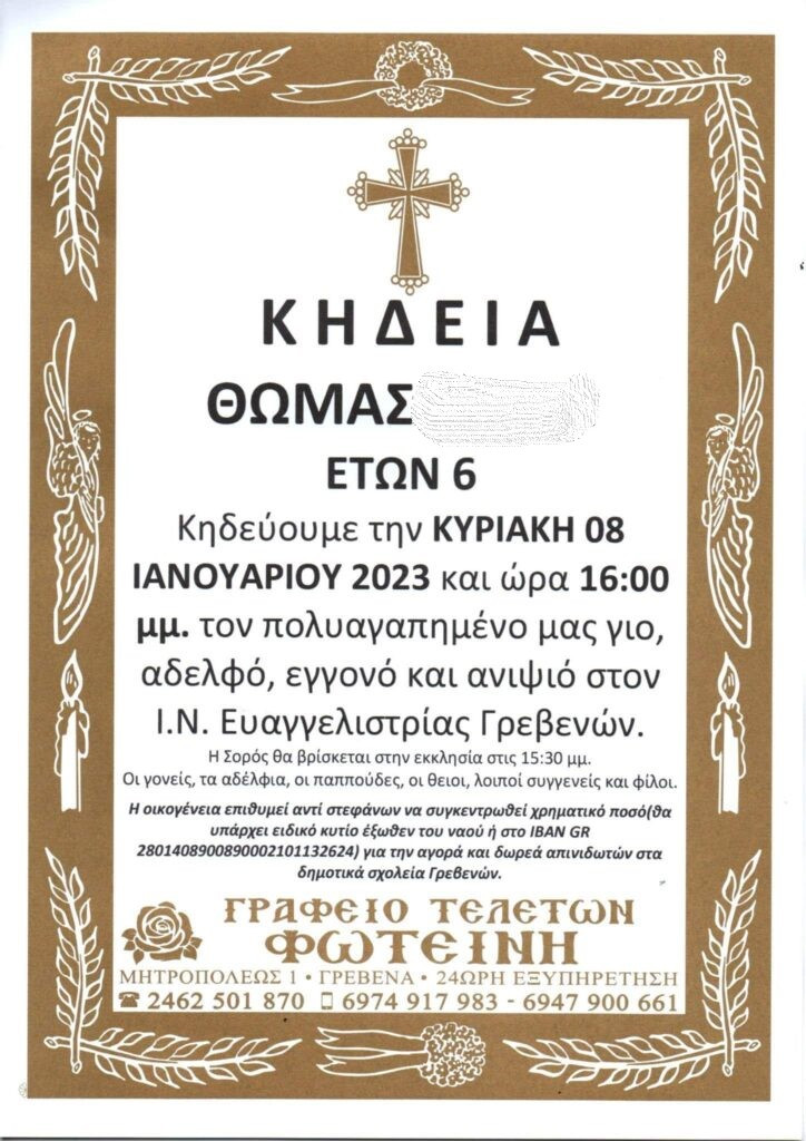 Το τελευταίο «αντίο» στον 6χρονο Θώμα από τα Γρεβενά που άφησε την τελευταία του πνοή στη ΜΕΘ Παίδων του Πανεπιστημιακού Γενικού Νοσοκομείου Πατρών θα πουν σήμερα οι γονείς, οι συγγενείς και οι φίλοι.