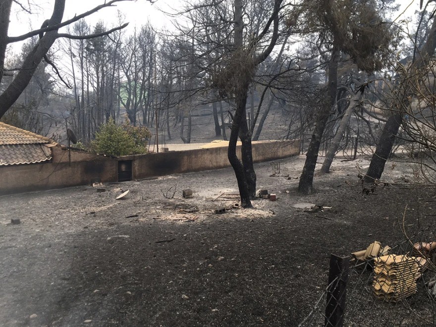 Λίγο πριν από τη 1 το μεσημέρι, στην περιοχή υπάρχουν σπίτια που έχουν παραδοθεί στις φλόγες, στην οδό Τριταίου.