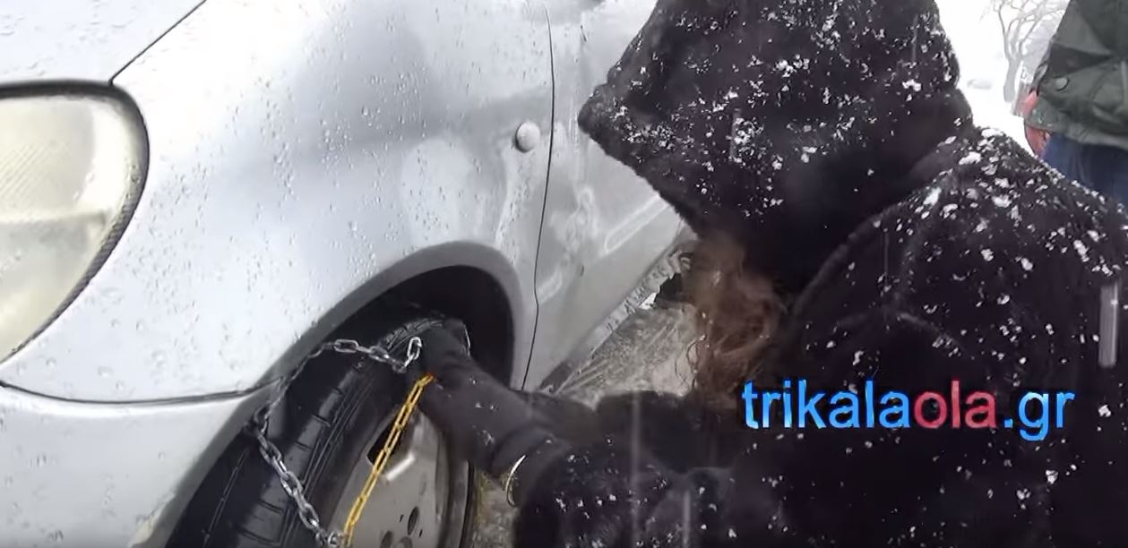 Άνδρες οδηγοί στα χιόνια – Χρήσιμες πληροφορίες: Στιγμιότυπο από την τοποθέτηση αλυσίδων γυναίκας σε αυτοκίνητο στην περιοχή της Πύλης Τρικάλων
