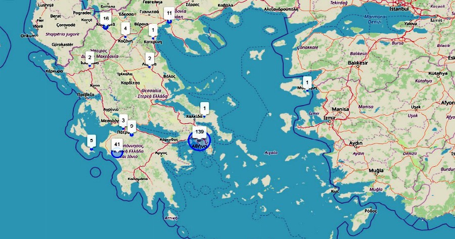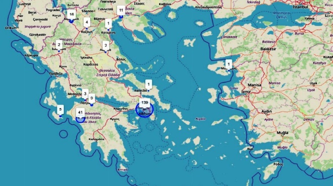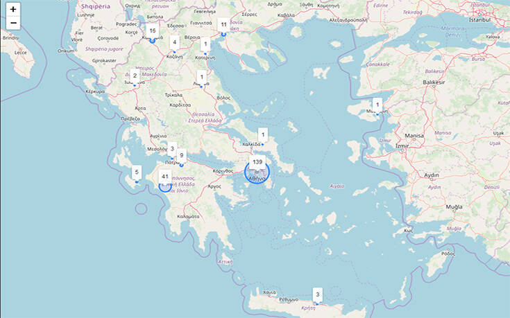 Ο χάρτης δημιουργήθηκε από την ομάδα Pineza για την ενημέρωση των πολιτών και βασίζεται σε διασταυρωμένες πληροφορίες από τον ΕΟΔΥ.