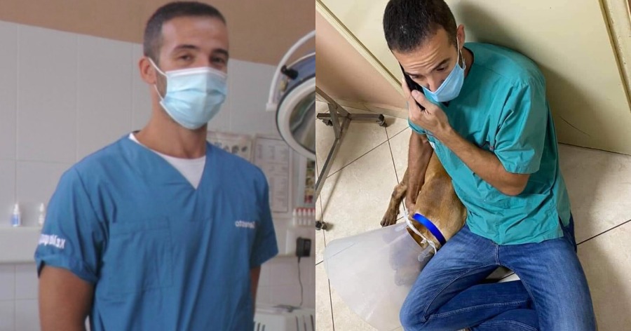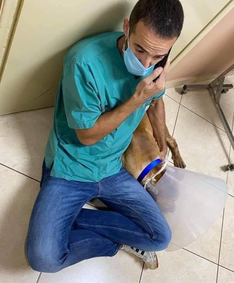 Μάλιστα, ένας χρήστης ανέβασε στο Facebook δύο φωτογραφίες του γιατρού με το τυχερό μέσα στην ατυχία του σκυλάκι να φορά κολάρο και έγραψε: